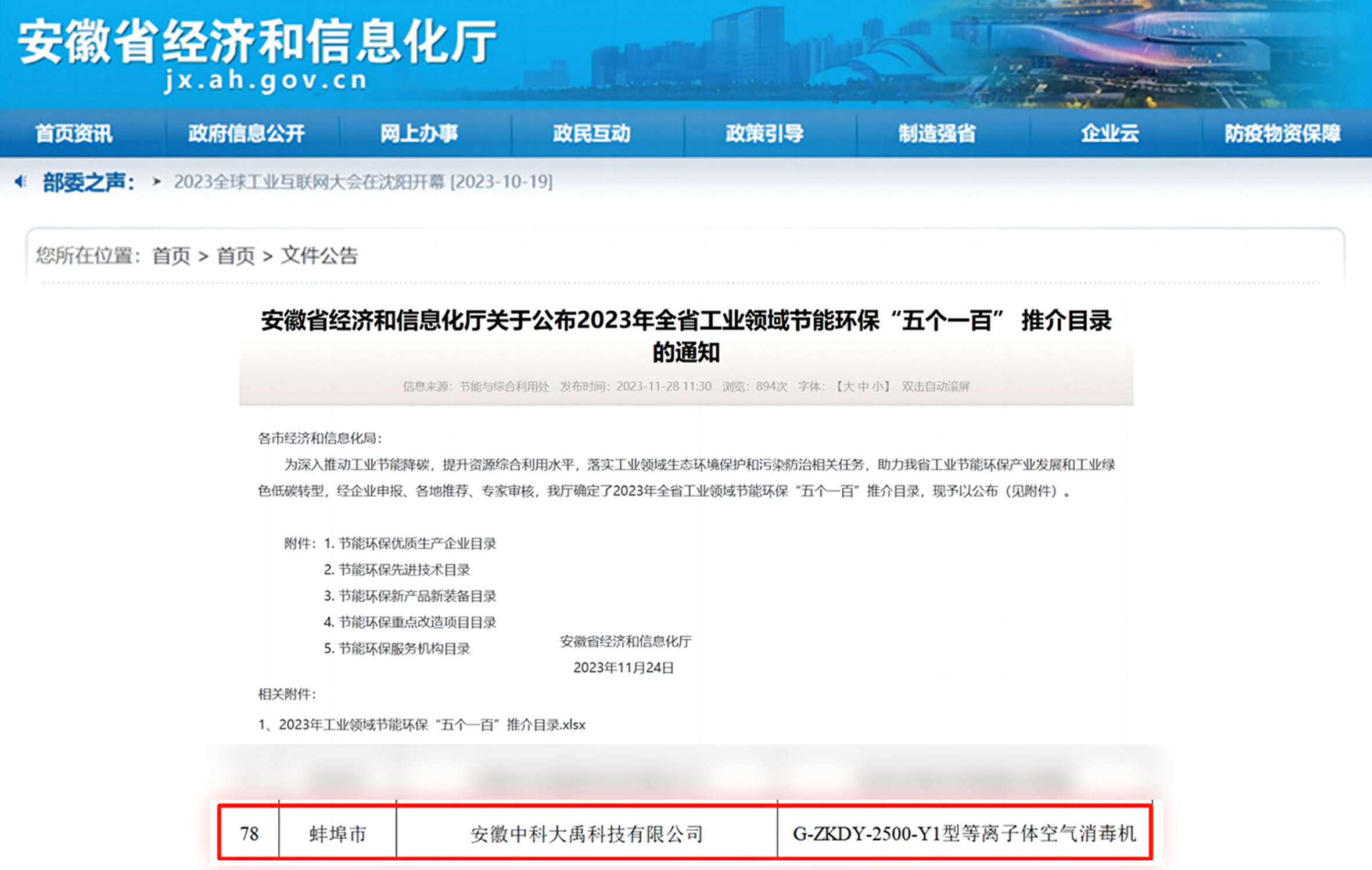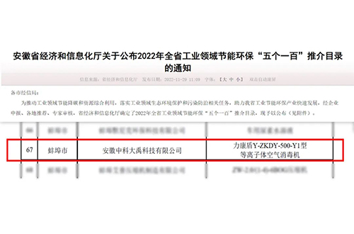 • 入選2023年全省工業(yè)領(lǐng)域節(jié)能環(huán)保“五個一百”推介目錄(節(jié)能環(huán)保新產(chǎn)品新裝備:G-ZKDY-2500-Y1型等離子體空氣消毒機(jī))