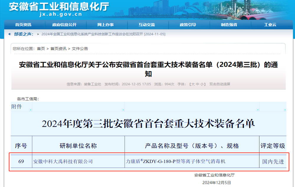 • 力康盾?ZKDY-G-180-P型等離子體空氣消毒機(jī)入選2024年度第三批安徽省首臺套重大技術(shù)裝備,評定等級:國內(nèi)先進(jìn)